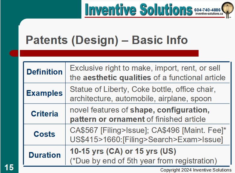 The Canadian equivalent of a US Design Patent application is the Industrial Design application which comprises similar requirements & limitations, namely protecting the appearance of a useful object. We can document, photograph & illustrate a design, and prepare the application for you.
